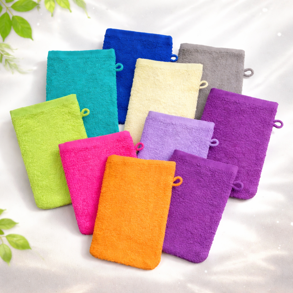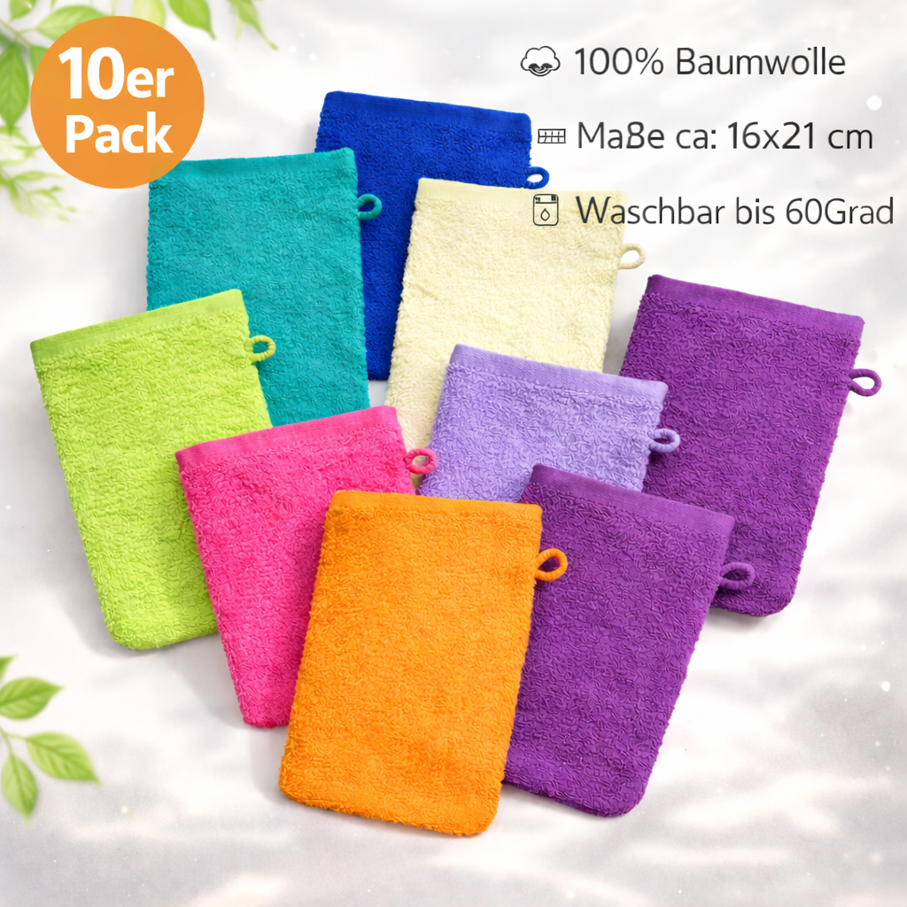 Produktinformationen "Waschhandschuh Frottier, 10 Stück sortiert, ca. 16x21cm, 100% Baumwolle, uni, einfarbig, Walk Frottee, Waschlappen"